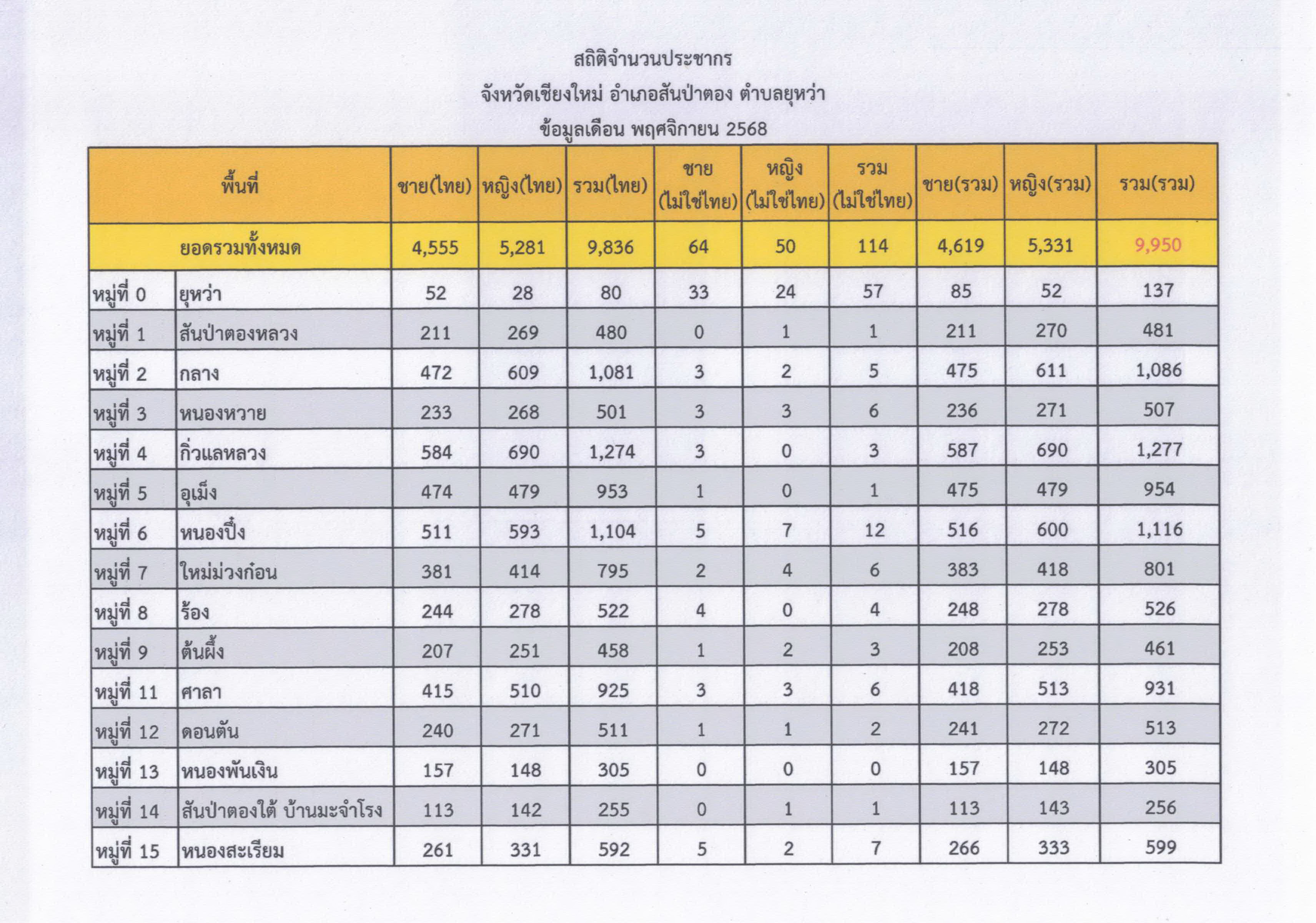 จำนวนครัวเรือน และจำนวนประชากร ในเขตพื้นที่เทศบาลตำบลยุหว่า