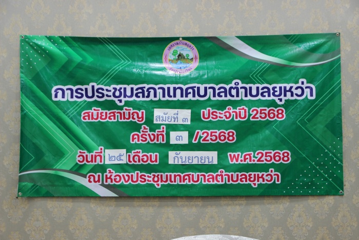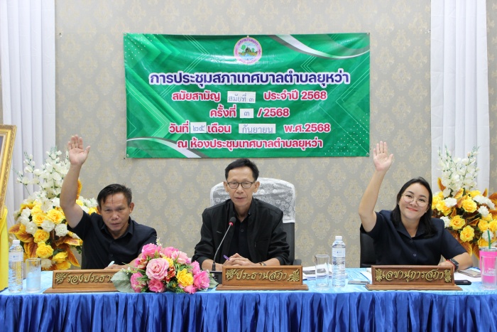 นายยุทธ คำแปง นายกเทศมนตรีตำบลยุหว่า คณะผู้บริหารฯ ส.ต.อ.หญิงพรรณทิพย์ โกสีย์ศิริกุล ปลัดเทศบาลตำบลยุหว่า นายบุญเจือ เชียงบุญ ประธานสภาเทศบาล พร้อมด้วยสมาชิกสภาเทศบาลเขต 1 และเขต 2 ผู้อำนวยการกองทุกกอง เข้าร่วมประชุมสภาเทศบาลตำบลยุหว่า สมัยสามัญ สมัยที่ 3 ประจำปี 2568 ครั้งที่ 3/2568 ณ ห้องประชุมเทศบาลตำบลยุหว่า