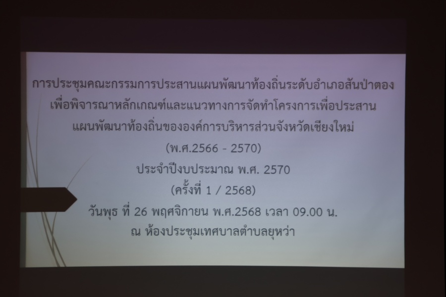 นายยุทธ คำแปง นายกเทศมนตรีตำบลยุหว่า ส.ต.อ.หญิงพรรณทิพย์ โกสีย์ศิริกุล ปลัดเทศบาลตำบลยุหว่า นายสุเมธ จิตตาดู หัวหน้าสำนักปลัด นายพินิจ สมหาร นักวิเคราะห์นโยบายและแผน ร่วมกับหน่วยงาน อปท.ในพื้นที่ เข้าประชุมคณะกรรมการประสานแผนพัฒนาท้องถิ่นแบบบูรณาการ ขององค์กรปกครองส่วนท้องถิ่นในระดับอำเภอสันป่าตองเพื่อพิจารณาหลักเกณฑ์และแนวทางการจัดทำโครงการเพื่อประสานแผนพัฒนาท้องถิ่นขององค์กการบริหารส่วนจังหวัดเชียงใหม่ (พ.ศ.2566 - 2570) ประจำปีงบประมาณ พ.ศ. 2570 ครั้งที่ 1/2568 ณ ห้องประชุมเทศบาลตำบลยุหว่า