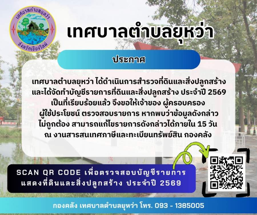 เทศบาลตำบลยุหว่า ได้ดำเนินการสำรวจที่ดินและสิ่งปลูกสร้าง และได้จัดทำบัญชีรายการที่ดินและสิ่งปลูกสร้าง ประจำปี 2569 เป็นที่เรียบร้อยแล้ว จึงขอให้เจ้าของ ผู้ครอบครอง ผู้ใช้ประโยชน์ ตรวจสอบรายการ หากพบว่าข้อมูลดังกล่าว ไม่ถูกต้อง สามารถแก้ไขรายการดังกล่าวได้ภายใน 15 วัน ณ งานสารสนเทศภาษีและทะเบียนทรัพย์สิน กองคลัง