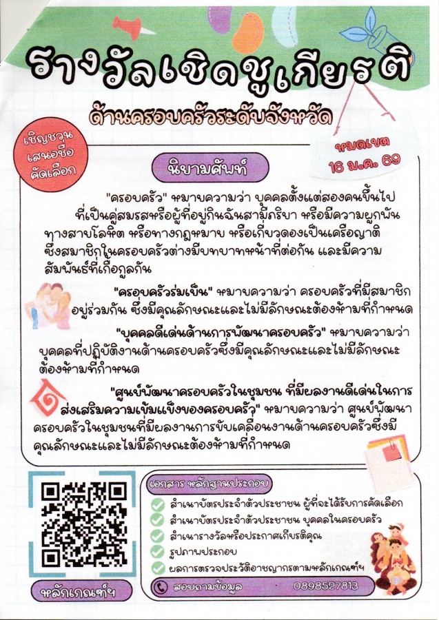 ขอเชิญเสนอชื่อคัดเลือกรางวัลเชิดชูเกียรติด้านครอบครัวระดับจังหวัด